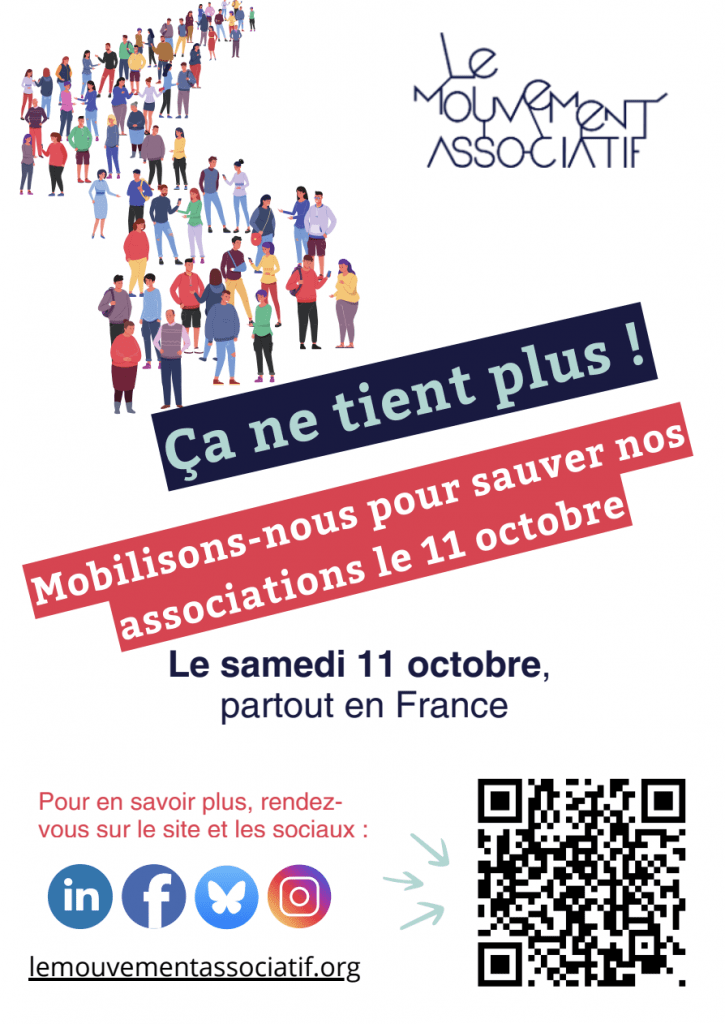 Le Mouvement associatif donne rendez-vous à toutes les associations le jeudi 11 octobre, partout en France, pour défendre ce bien commun sans lequel la cohésion sociale, la solidarité et la démocratie sont en danger. Ensemble, faisons entendre la voix du secteur associatif : parce que ça ne tient plus !